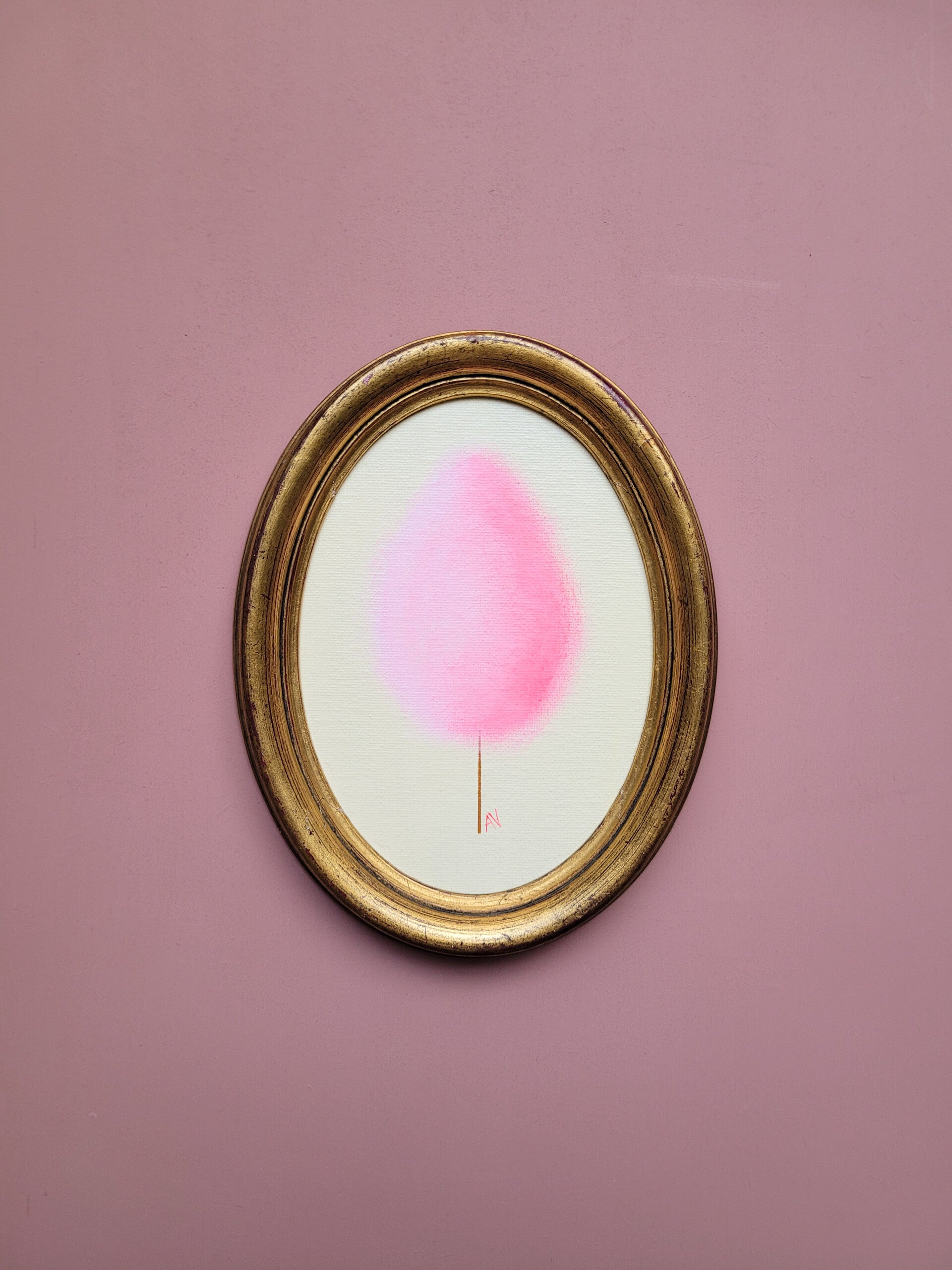 De kleuren van deze suikerspin gaan van zachtroze naar fluor. Een prachtig werk voor aan de wand. Hij zit in een oud lijstje met lichte gebruiksporen maar dat is zeker niet storend.
