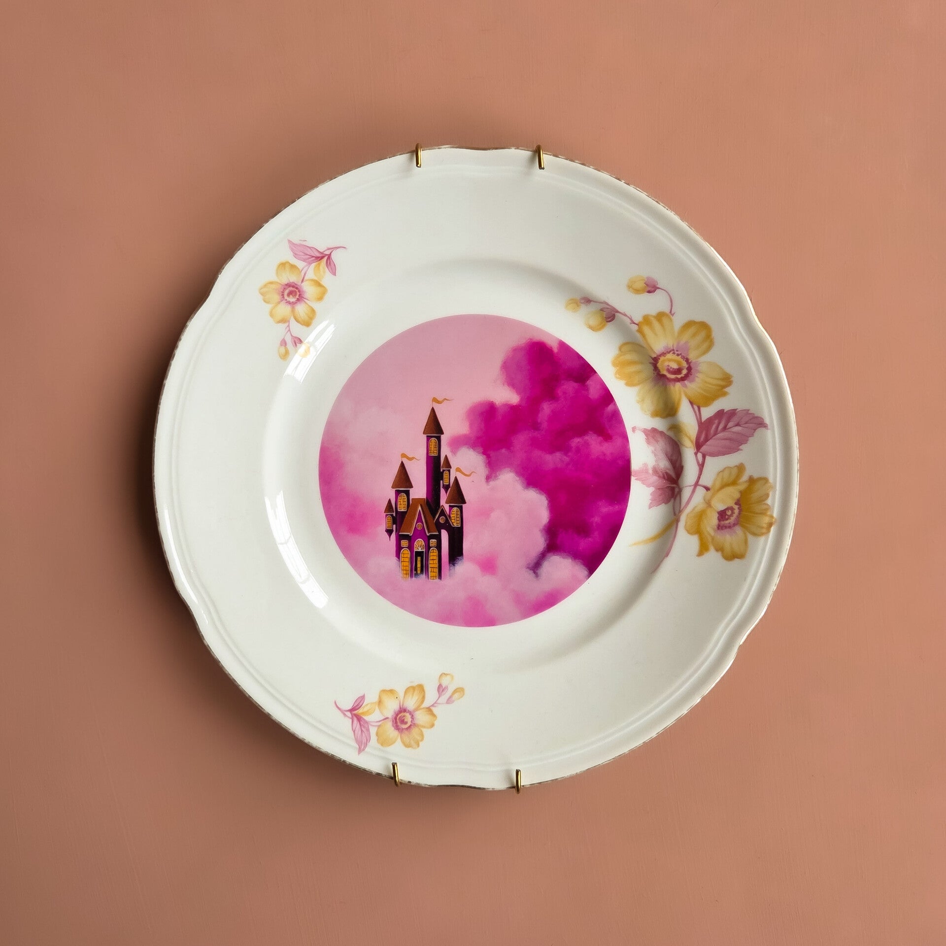 Handgedrukt op een wit vintage bord met een bloemen roze en gouden deco rand.